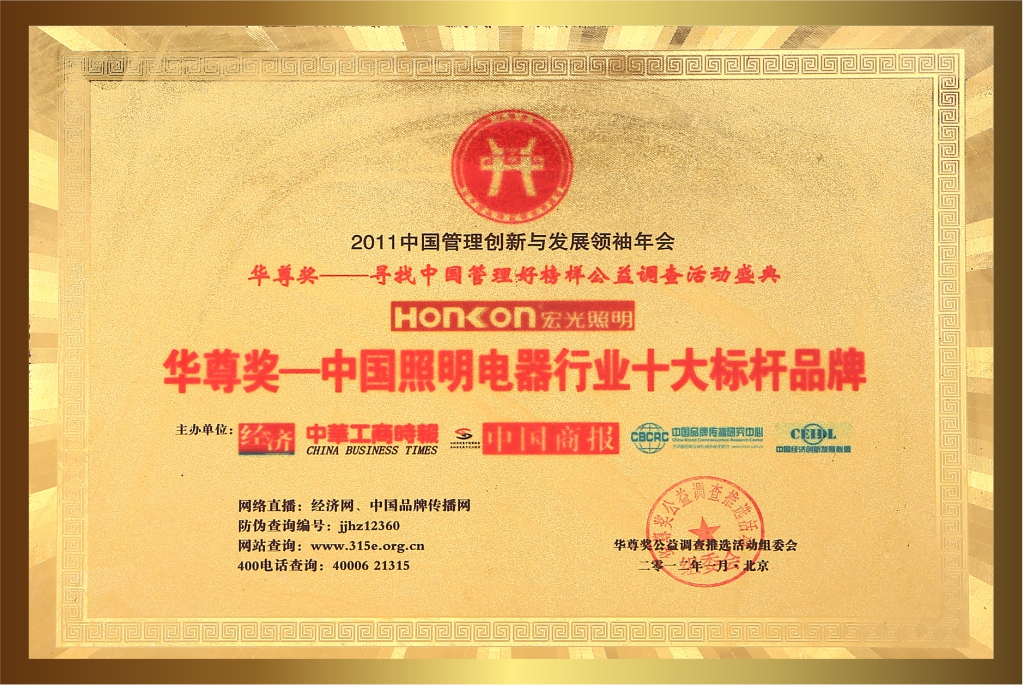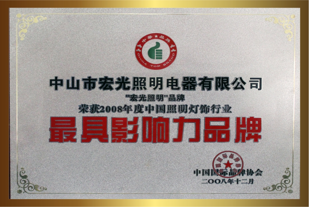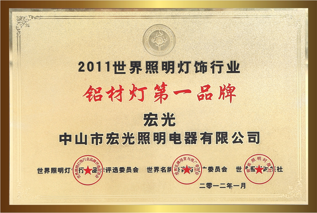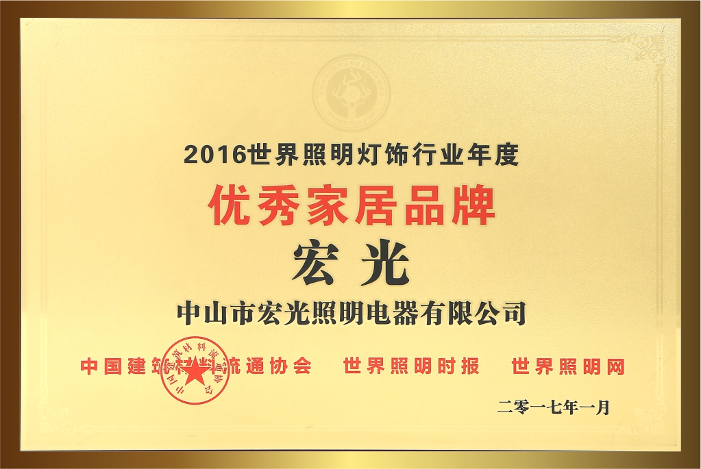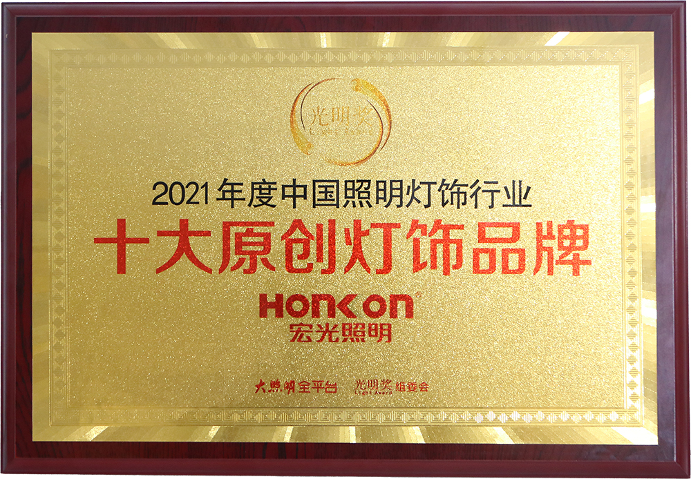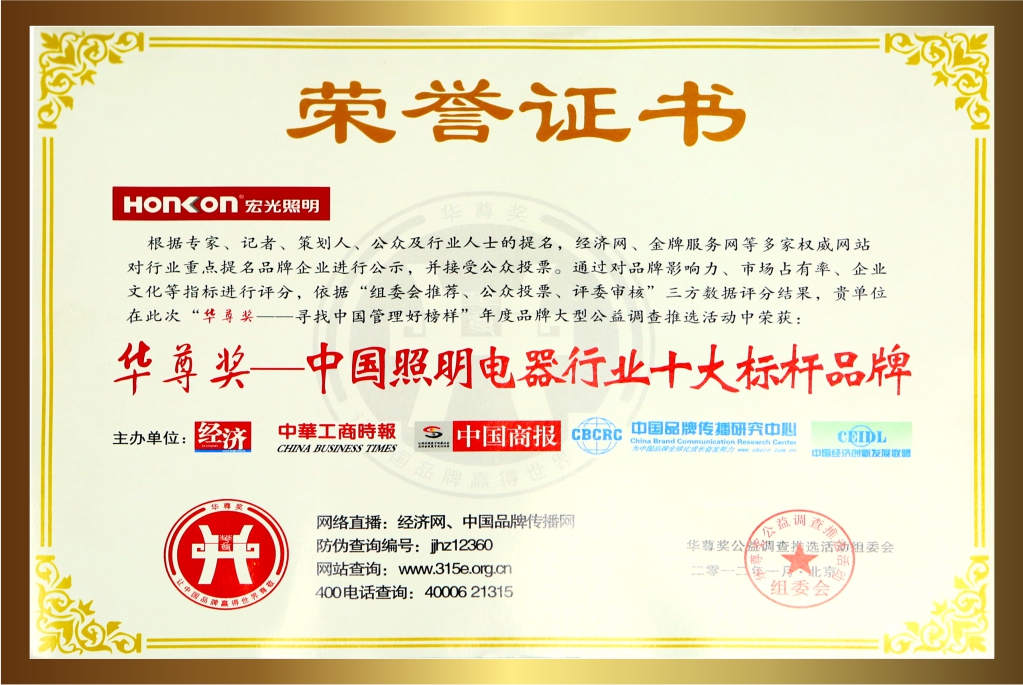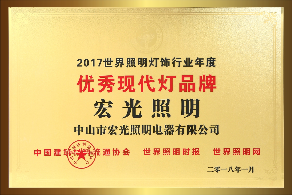 自創(chuàng)立20多年以來,宏光照明一直堅持卓越的品質(zhì)與服務(wù),深受客戶的喜愛與信賴。品牌連續(xù)多年榮獲眾多的行業(yè)認(rèn)可與殊榮,包括:“鋁材燈第一品牌”“十大現(xiàn)代燈品牌” “十大燈光照明品牌” “十大美式燈品牌”“全國LED行業(yè)十佳品牌”“中國質(zhì)量500強”“質(zhì)量、服務(wù)、信譽AAA品牌”等榮譽。