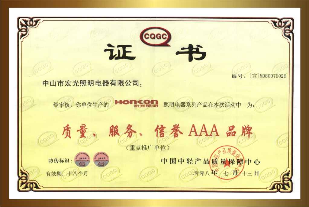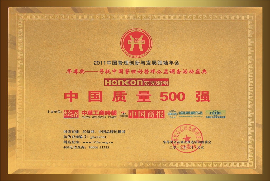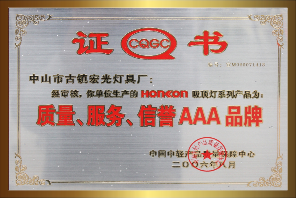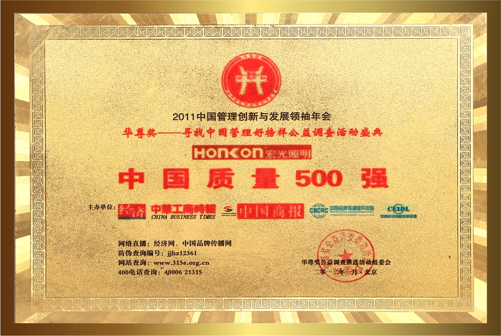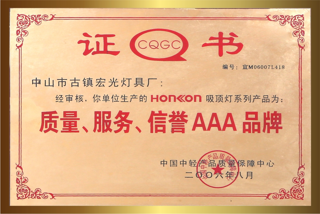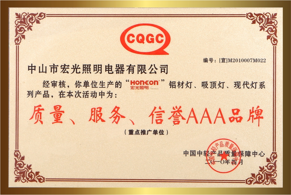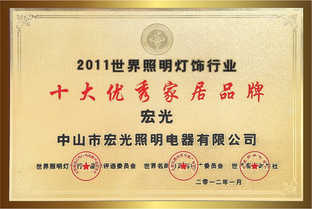 自創(chuàng)立20多年以來,宏光照明一直堅持卓越的品質(zhì)與服務(wù),深受客戶的喜愛與信賴。品牌連續(xù)多年榮獲眾多的行業(yè)認(rèn)可與殊榮,包括:“鋁材燈第一品牌”“十大現(xiàn)代燈品牌” “十大燈光照明品牌” “十大美式燈品牌”“全國LED行業(yè)十佳品牌”“中國質(zhì)量500強”“質(zhì)量、服務(wù)、信譽AAA品牌”等榮譽。