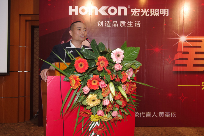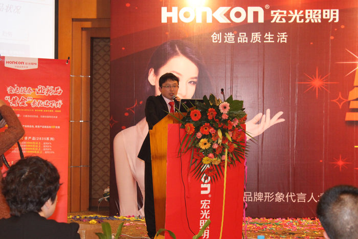 3月12日14:30,會(huì)議正式拉開帷幕。宏光照明總經(jīng)理黃亮竣、副總經(jīng)理黃權(quán)國分別致開幕辭。黃亮竣首先對(duì)出席本次會(huì)議的所有經(jīng)銷商及來賓表示了歡迎和感謝,對(duì)2013年取得的成績做了充分肯定,他說,2013年在受行業(yè)市場及房地產(chǎn)調(diào)控低迷的影響,我們迎難而上,依然取得了可喜的成績,非常感謝大家的支持。其次對(duì)2014年總體戰(zhàn)略部署做出了整體規(guī)劃:他強(qiáng)調(diào)指出2014年的發(fā)展要遵循123工程,計(jì)劃在2013-2015年內(nèi)在終端專賣店打造上,采取全新的模式,致力于打造100家鉆石級(jí)客戶,200家白金級(jí)客戶,300家黃金級(jí)客戶;另外,2014年為宏光照明的品質(zhì)服務(wù)年,將以產(chǎn)品和服務(wù)為核心,以客戶為導(dǎo)向,堅(jiān)決推廣和落實(shí)“四新服務(wù)”,即全新的SI形象、新產(chǎn)品的個(gè)性化、智能化、人性化,新的盈利模式、專人專職的新服務(wù),努力提高服務(wù)質(zhì)量,打造品質(zhì)化服務(wù)。