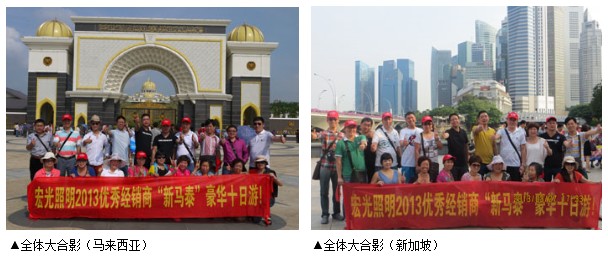 2013年3月22-31日,宏光照明組織了全國優(yōu)秀經(jīng)銷商“新馬泰”豪華十日游活動(dòng),參觀游玩了新加坡、馬來西亞、泰國等3個(gè)國家。本次旅游活動(dòng)是對(duì)2012年工作中高度配合以及超額完成既定目標(biāo)的經(jīng)銷商們進(jìn)行的獎(jiǎng)勵(lì),充分肯定他們?cè)谶^去一年所取得的成績和做出的貢獻(xiàn)。本次旅游活動(dòng)由公司營銷副總董小芳、營銷總監(jiān)于喜慶等高層領(lǐng)導(dǎo)領(lǐng)隊(duì),來自全國各區(qū)域的30名優(yōu)秀經(jīng)銷商參與了此次旅游活動(dòng)。