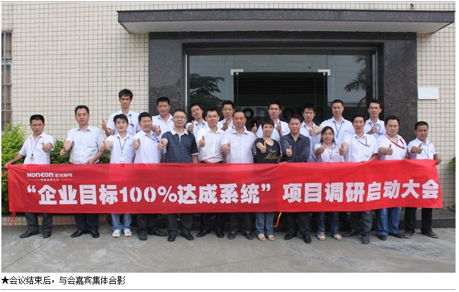 會上,宏光照明黃總發(fā)表了熱情洋溢的講話。他指出,正處于發(fā)展與跨越期的宏光照明,早已將企業(yè)目標(biāo)100%達(dá)成系統(tǒng)納入作為公司的戰(zhàn)略管理中,本次“企業(yè)目標(biāo)100%達(dá)成系統(tǒng)”項(xiàng)目調(diào)研啟動大會標(biāo)志著宏光照明推行企業(yè)目標(biāo)100%達(dá)成系統(tǒng)邁出了執(zhí)行的第一步;他強(qiáng)調(diào),在與合才的長達(dá)14個月的指導(dǎo)與幫助下,宏光照明各部門在工作的開展與執(zhí)行過程中將會得到更好的改善與提升,這樣將為順利實(shí)現(xiàn)宏光的升級轉(zhuǎn)型、提升企業(yè)增長方式及發(fā)展方式奠定堅(jiān)實(shí)的基礎(chǔ)。