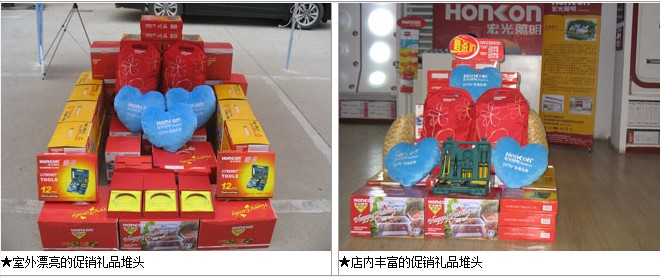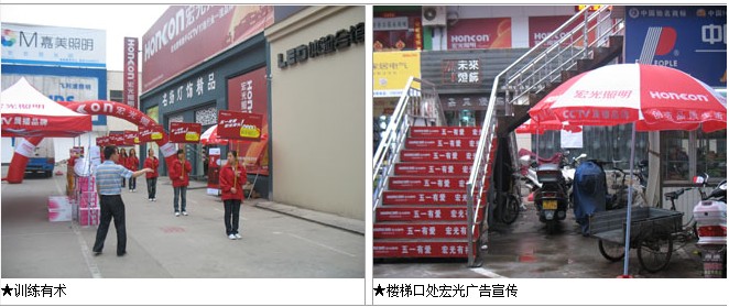 活動(dòng)前期,各區(qū)域營銷人員有計(jì)劃有目的地申請(qǐng)活動(dòng),待審批后與區(qū)域經(jīng)銷商進(jìn)行活動(dòng)的籌備工作,市場(chǎng)部也派專人前往市場(chǎng)進(jìn)行工作指導(dǎo);活動(dòng)現(xiàn)場(chǎng),宏光營銷人員與經(jīng)銷商的營銷團(tuán)隊(duì)共同進(jìn)行“五一”的宣傳推廣預(yù)熱和氛圍營造,他們?cè)趯I(yè)市場(chǎng)、小區(qū)、大型超市門口等人流量集中場(chǎng)所和地區(qū)進(jìn)行“五一”促銷活動(dòng)的宣傳預(yù)熱,紅色的廣告衫、漂亮的氣球拱門、店內(nèi)的產(chǎn)品堆頭架、禮品堆頭架、熱賣氣氛等促銷氛圍不斷地召喚著過往的人群駐足觀望及入住店內(nèi),形成購買。