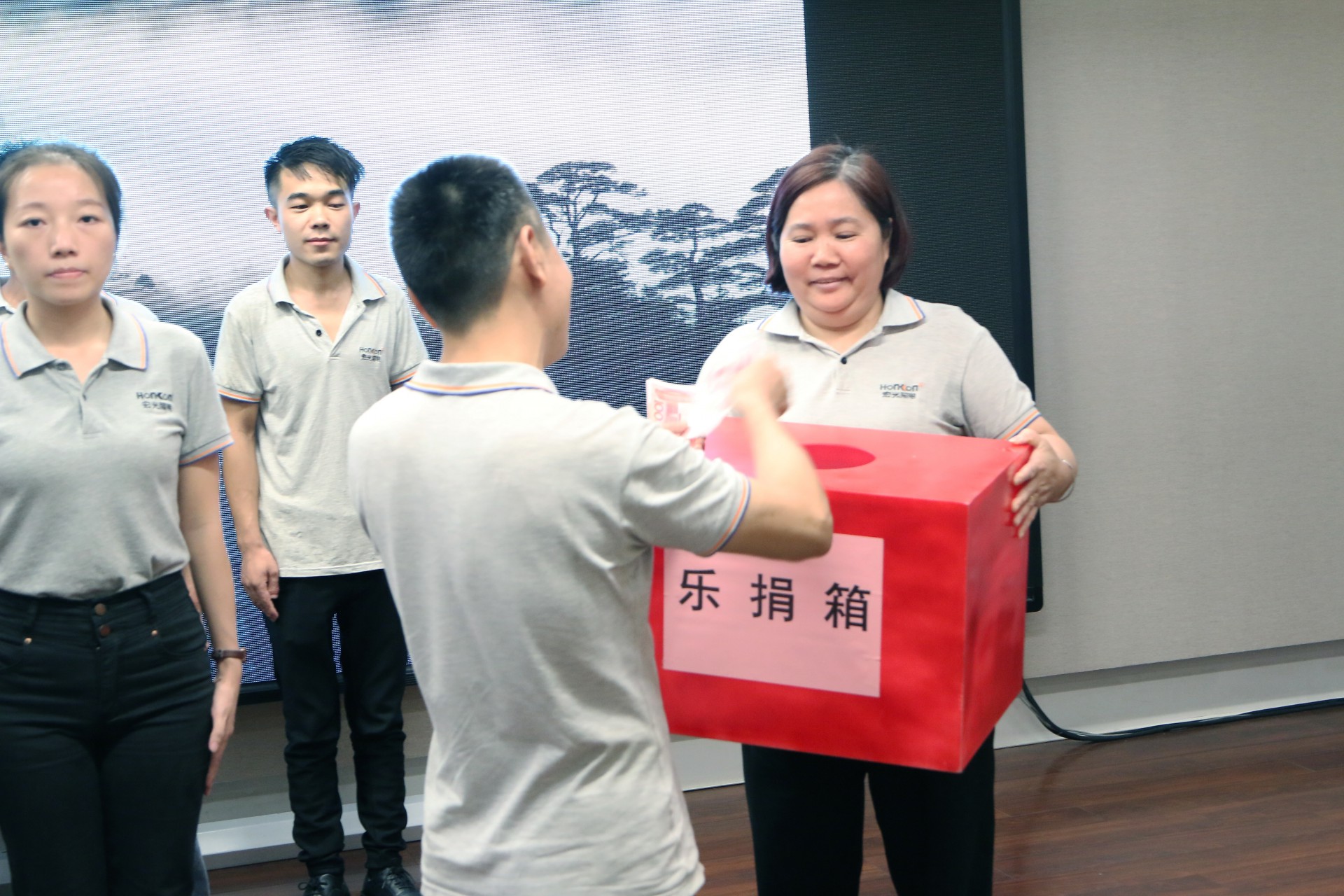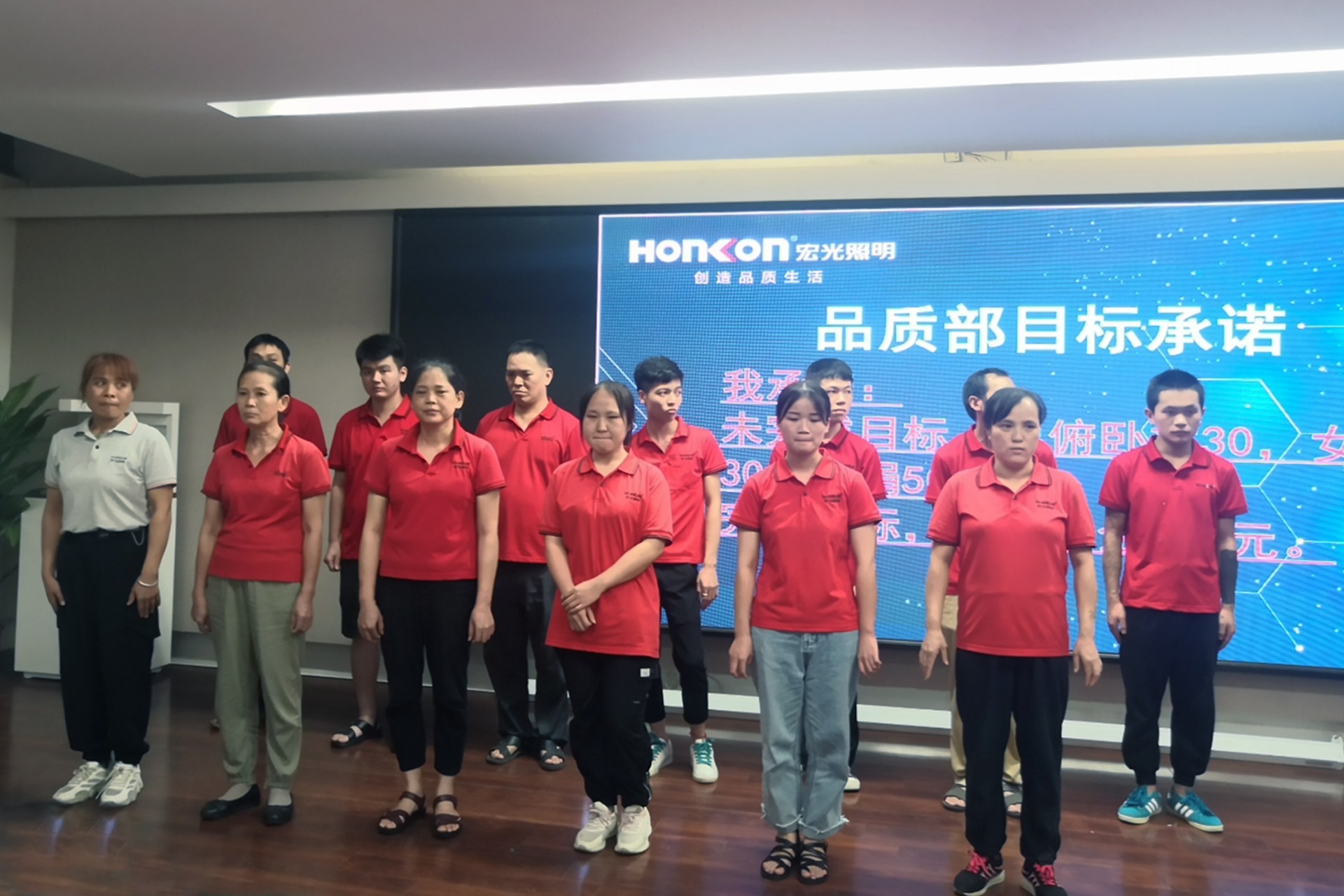 在承諾兌現(xiàn)中大家都履行承諾作出了資金及體力兌現(xiàn),其中有一位女員工鄧愛(ài)青表現(xiàn)尤為突出,在接受完團(tuán)隊(duì)“深蹲30個(gè)負(fù)激勵(lì)”后身體不適的情況下,在團(tuán)隊(duì)展示PK環(huán)節(jié)接受“深蹲20個(gè)負(fù)激勵(lì)”,主持人特批她可以免罰時(shí)仍堅(jiān)持接受負(fù)激勵(lì)并向主持人申請(qǐng)采用俯臥撐形式來(lái)完成,這種一諾千金、堅(jiān)持到底、永不言棄的高貴品質(zhì)就是我們宏光人的精神。