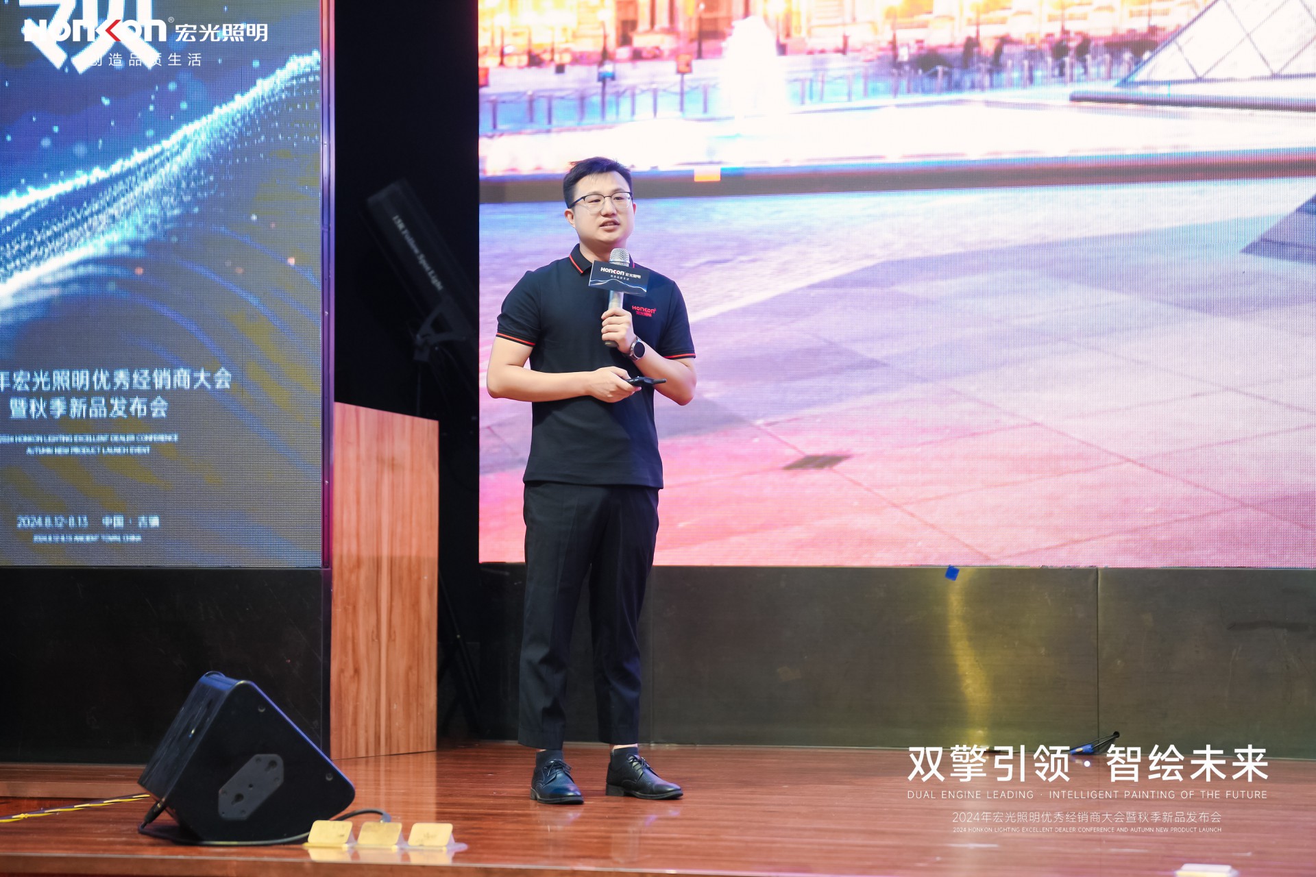 商照新品 強(qiáng)勢(shì)領(lǐng)跑隨后,宏光照明商照總監(jiān)李叢發(fā)表了《商照產(chǎn)品規(guī)劃及新品發(fā)布》的精彩演講。他重點(diǎn)圍繞各種商業(yè)空間的用光特點(diǎn),向與會(huì)嘉賓介紹了最新商照產(chǎn)品的亮點(diǎn)與應(yīng)用案例。李總表示,宏光照明始終以市場(chǎng)需求作為產(chǎn)品開(kāi)發(fā)的驅(qū)動(dòng)力,持續(xù)推出極具技術(shù)含量和市場(chǎng)競(jìng)爭(zhēng)力優(yōu)勢(shì)的商照產(chǎn)品。他認(rèn)為,產(chǎn)品升級(jí)是保持品牌優(yōu)勢(shì)的核心。他從市場(chǎng)前景、應(yīng)用領(lǐng)域、商照產(chǎn)品特點(diǎn)等方面,讓與會(huì)者對(duì)宏光照明全新升級(jí)的商照產(chǎn)品有了更深入的了解。同時(shí),李叢還提到,宏光照明將以更加豐富多元的智能全生態(tài)產(chǎn)品服務(wù)市場(chǎng),滿足不同用戶的多樣化需求,并提供個(gè)性化智能產(chǎn)品解決方案,助力經(jīng)銷商在終端市場(chǎng)取得更大成功。