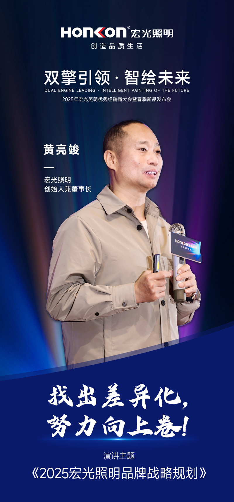 宏光照明創(chuàng)始人兼董事長(zhǎng)黃亮竣在大會(huì)開場(chǎng)致辭中,以全局視角剖析行業(yè)困境:新增樓盤減少、風(fēng)格變化、消費(fèi)降級(jí)、同質(zhì)化嚴(yán)重、市場(chǎng)競(jìng)爭(zhēng)極度內(nèi)卷等挑戰(zhàn)。他強(qiáng)調(diào):要從行業(yè)的困境中突圍,就必須捉住本質(zhì),擁抱變化,才能擁抱未來。為應(yīng)對(duì)挑戰(zhàn),黃亮竣正式發(fā)布2025年品牌核心戰(zhàn)略——以“智能現(xiàn)代燈+智能燈光照明”雙引擎模式為驅(qū)動(dòng),通過宏光輕智能、宏光臻選、全光譜系列三大方向持續(xù)深化模式,為終端經(jīng)銷商持續(xù)賦能,助力他們?cè)谑袌?chǎng)競(jìng)爭(zhēng)中實(shí)現(xiàn)穩(wěn)健增長(zhǎng)。
