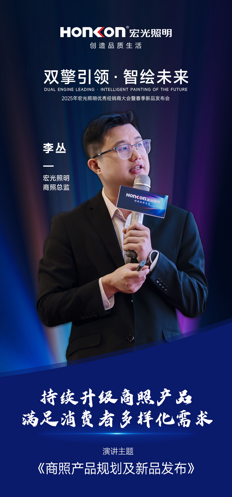 隨后,宏光照明商照總監(jiān)李叢帶來了《商照產(chǎn)品規(guī)劃及新品發(fā)布》的精彩演講。李總圍繞全新的商照產(chǎn)品、智能展廳以及商照服務(wù)展開詳細(xì)闡述。他強(qiáng)調(diào),產(chǎn)品升級(jí)是保持品牌競(jìng)爭(zhēng)優(yōu)勢(shì)的核心,而全新升級(jí)的商照產(chǎn)品以市場(chǎng)前景、應(yīng)用領(lǐng)域和技術(shù)特點(diǎn)為切入點(diǎn),為經(jīng)銷商提供創(chuàng)新的解決方案。李總還透露,宏光照明將進(jìn)一步豐富智能全生態(tài)產(chǎn)品線,提供多樣化的個(gè)性化智能照明解決方案,以更高效、更全面的產(chǎn)品服務(wù)市場(chǎng),滿足消費(fèi)者多樣化需求,助力經(jīng)銷商在終端市場(chǎng)取得更大成功。