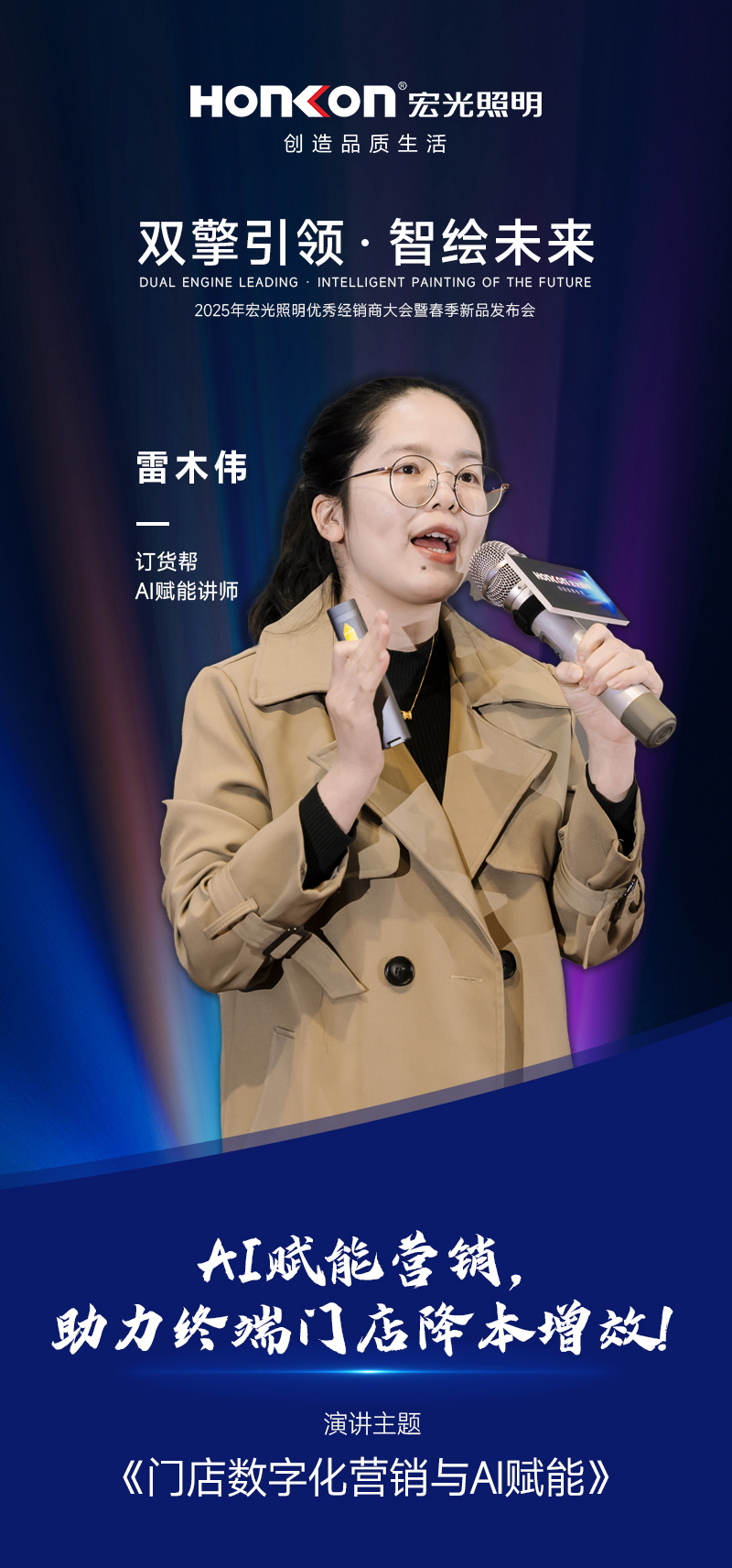本次發(fā)布會(huì)特別邀請(qǐng)了訂貨幫AI賦能講師雷木偉,與現(xiàn)場(chǎng)經(jīng)銷商分享AI數(shù)字化營(yíng)銷經(jīng)驗(yàn)。雷老師通過生動(dòng)的案例,詳細(xì)講解了如何借助AI數(shù)字化手段精準(zhǔn)引流,最終實(shí)現(xiàn)業(yè)務(wù)的持續(xù)增長(zhǎng)。他還介紹了AI技術(shù)如何全面融入終端運(yùn)營(yíng),從引流到店到促成成交,大幅提升了門店效率,為經(jīng)銷商提供了全新的營(yíng)銷思路與實(shí)操方法。