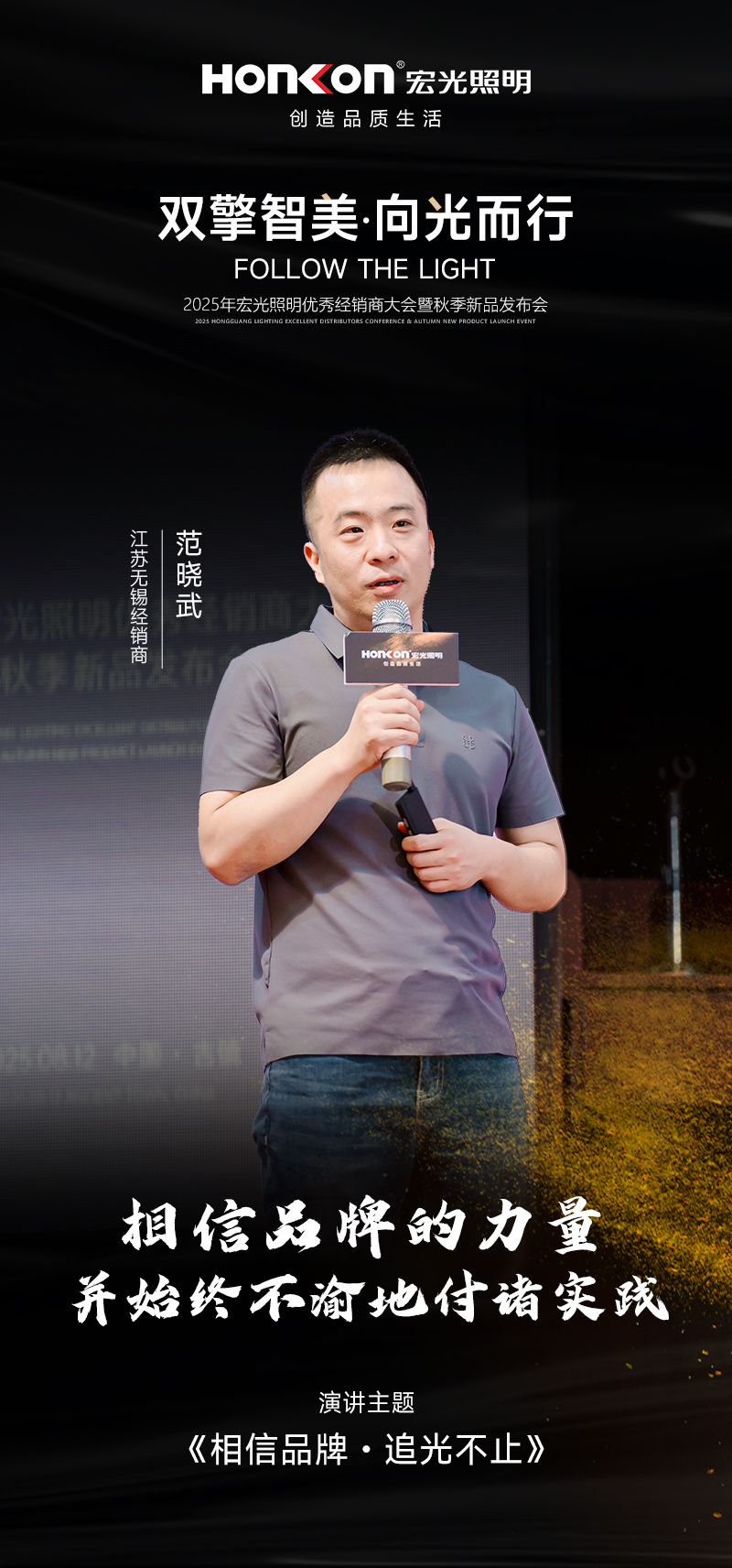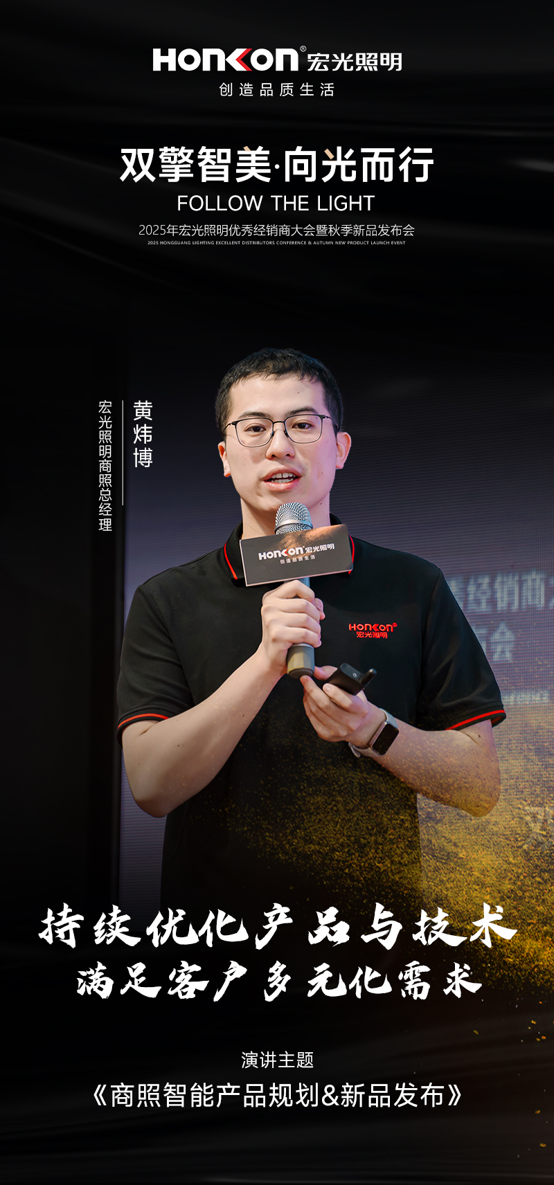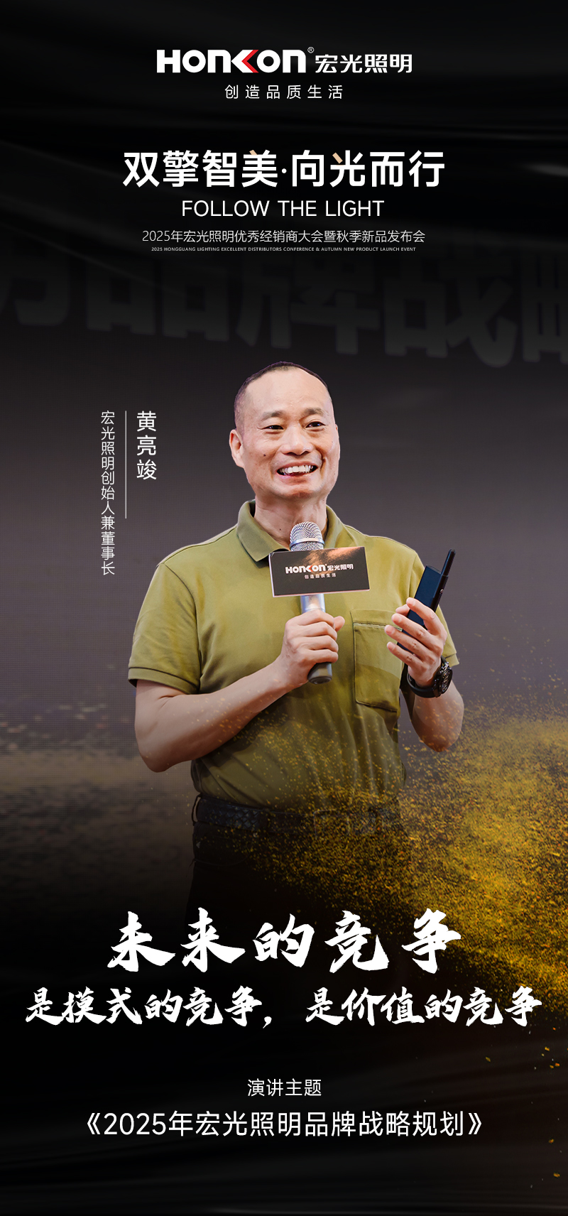 在2025年秋季新品發(fā)布會現(xiàn)場,宏光照明創(chuàng)始人兼董事長黃亮竣以 “致敬追光者” 拉開序幕。他滿懷深情地向所有奮戰(zhàn)在一線、不懈追光的經(jīng)銷商和合作伙伴表達了崇高敬意。他強調(diào),正是這些專注專業(yè)、不懈追光的人,為行業(yè)帶來了源源不斷的光亮和希望,是宏光照明能夠在激烈市場競爭中持續(xù)前行的核心力量。