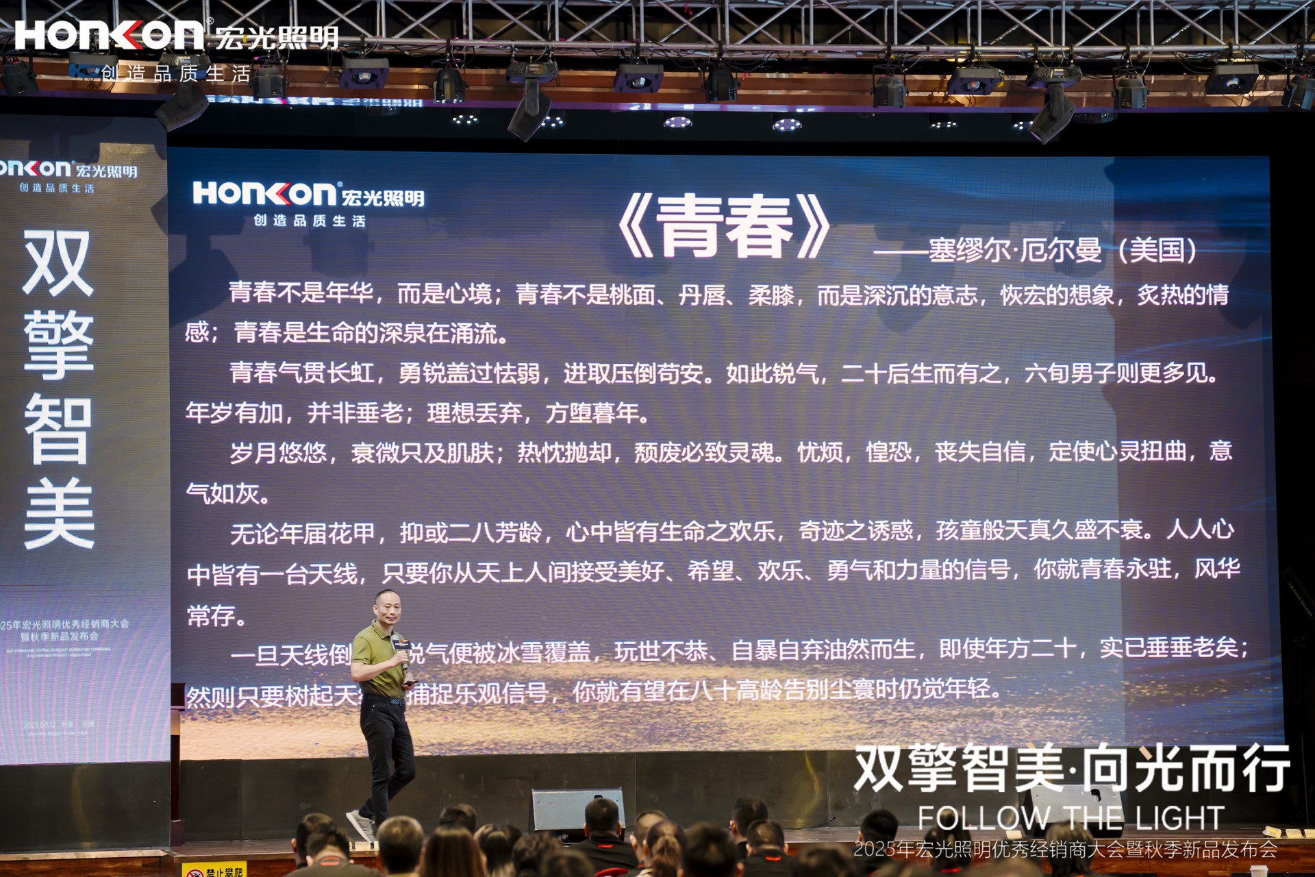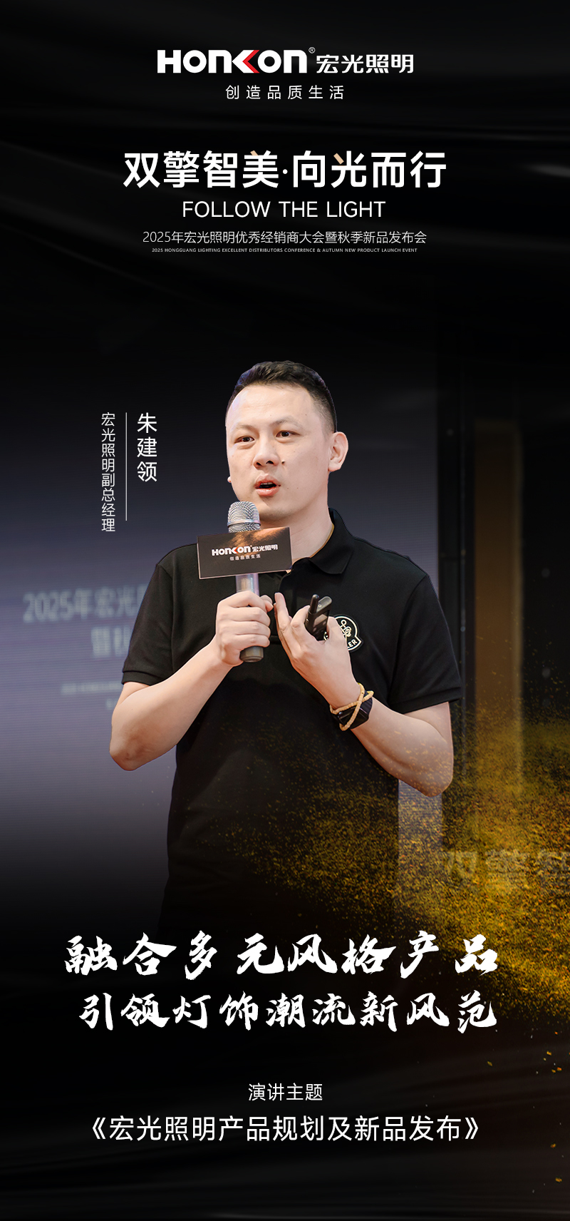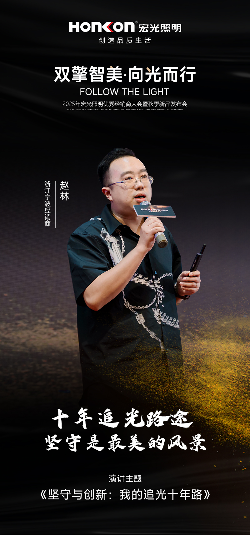 在2025年秋季新品發(fā)布會現(xiàn)場,宏光照明創(chuàng)始人兼董事長黃亮竣以 “致敬追光者” 拉開序幕。他滿懷深情地向所有奮戰(zhàn)在一線、不懈追光的經(jīng)銷商和合作伙伴表達了崇高敬意。他強調(diào),正是這些專注專業(yè)、不懈追光的人,為行業(yè)帶來了源源不斷的光亮和希望,是宏光照明能夠在激烈市場競爭中持續(xù)前行的核心力量。